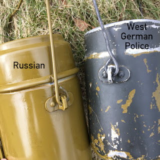 I took some photos to compare an original pre-war aluminum Wehrmacht mess kits, with some postwar versions. The most important thing to understand is that there are postwar mess kits that are identical to real ones, as well as some that are very close, and some that are more different.