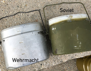 Where to find these? Quantities of postwar Romanian and Austrian mess kits pop up on eBay from time to time. I keep an eye on the various Facebook sales groups where reenactors sell items that are no longer needed, as there are many of these mess kits in circulation. I also look at Soviet buy/sell/trade pages where the Russian ones that I regard as usable (with the German type bale fittings) come up every so often.